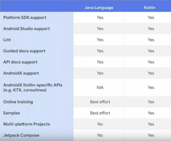 表中可以看到,Kotlin 相比 Java,在 Android 開(kāi)發(fā)中確實(shí)獲得了更加重要的地位,“比如在線(xiàn)培訓、樣本,我們首先會(huì )在 Kotlin 中支持,Java 中將是‘盡力而為’。同時(shí),有一些功能,如多平臺項目和 Jetpack Compose,只會(huì )在 Kotlin 中提供。”