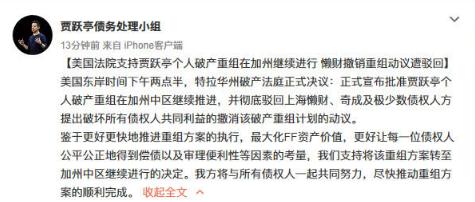 12 月 19 日早間,賈躍亭債務(wù)處理小組微博賬號 19 日公開(kāi)表示,美國東岸時(shí)間下午兩點(diǎn)半,特拉華州破產(chǎn)法庭正式?jīng)Q議:正式宣布批準賈躍亭個(gè)人破產(chǎn)重組在加州中區繼續推進(jìn),駁回上海懶財、奇成及極少數債權人方提出破壞所有債權人共同利益的撒消該破產(chǎn)重組計劃的動(dòng)議。
