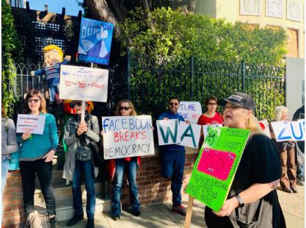 戴利市居民凱瑟琳·多布森(Kathleen Dobson)舉著(zhù)一塊亮粉色和綠色相間的標語(yǔ),上面寫(xiě)著(zhù)“叫醒扎克!扎克為了賺錢(qián)向俄羅斯人出售廣告。” 她說(shuō),Facebook 應該停止接受含有錯誤信息的廣告,并刪除被操縱的視頻,比如眾議院議長(cháng)南希·佩洛西(Nancy Pelosi)看起來(lái)似乎醉酒的視頻。