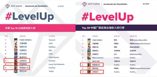 世紀華通公告顯示,上半年游戲出海收入 29.19 億元,在總營(yíng)收中占比 37.57%。根據 App Annie 發(fā)布的 2020 年 Q1-Q2 中國應用出海收入榜單,點(diǎn)點(diǎn)互動(dòng)旗下兩款拳頭 SLG 產(chǎn)品《火槍紀元》和《阿瓦隆之王》依然穩居頭部陣營(yíng),在前十名中強勢占據兩席。