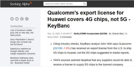 北京時(shí)間周五凌晨有媒體報道稱(chēng),華爾街投行 Keybanc 分析師 John Vinh 表示,高通已獲得向華為出口 4G 芯片的許可證。