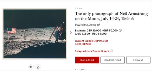 此次拍賣(mài)的亮點(diǎn)是一張阿姆斯特朗站在月球表面的照片,該照片由巴茲·奧爾德林(Buzz Aldrin)拍攝,拍賣(mài)預售估價(jià)在 37800 美元(約合人民幣 25 萬(wàn))到 63000 美元(約合人民幣 42 萬(wàn))。