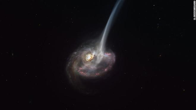 圖:遙遠星系 ID2299 的藝術(shù)渲染圖,其大量氣體在兩個(gè)星系碰撞后以“潮汐尾巴”的形式噴射出來(lái)