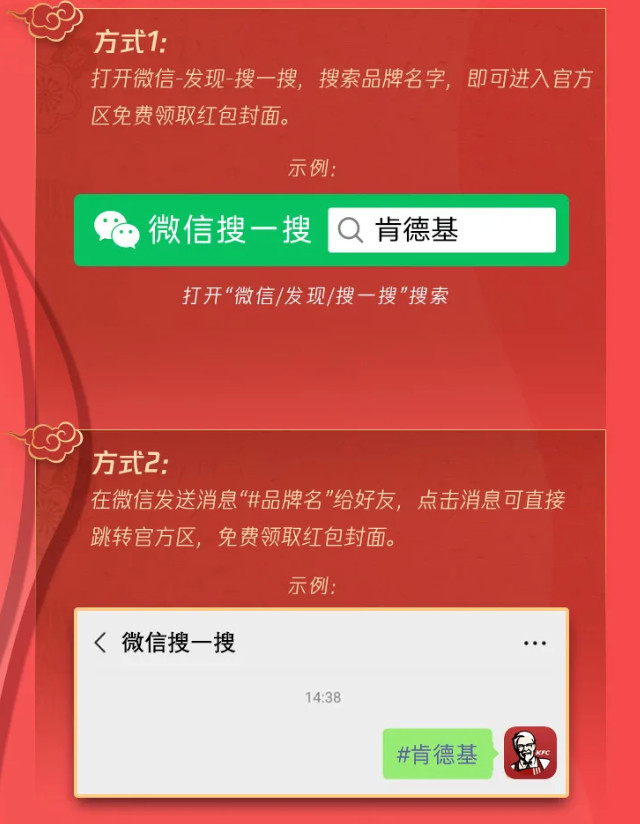 用戶(hù)打開(kāi)“微信-發(fā)現-搜一搜”,搜索品牌名字,即可進(jìn)入官方區免費領(lǐng)取紅包封面;或者在微信發(fā)送消息“#品牌名”給好友,點(diǎn)擊消息可直接跳轉官方區,免費領(lǐng)取紅包封面。
