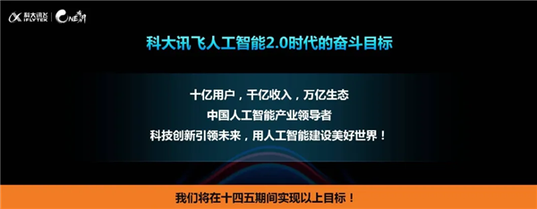 今天,科大訊飛發(fā)布人工智能 2.0 時(shí)代的奮斗目標:十億用戶(hù),千億收入,萬(wàn)億生態(tài)。