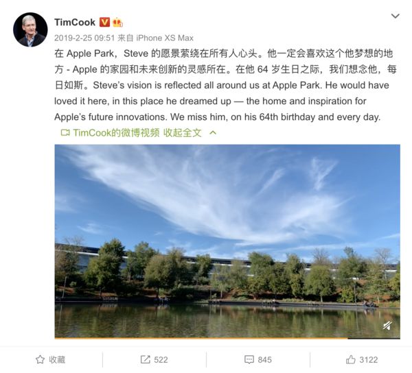 早在 2019 年,庫克就曾在社交媒體表示,在 Apple Park,Steve 的愿景縈繞在所有人心頭。他一定會(huì )喜歡這個(gè)他夢(mèng)想的地方——Apple 的家園和未來(lái)創(chuàng )新的靈感所在。在他 64 歲生日之際,我們想念他,每日如斯。