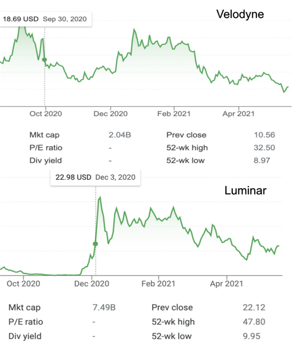 Velodyne和luminar上市后的股價(jià)走勢