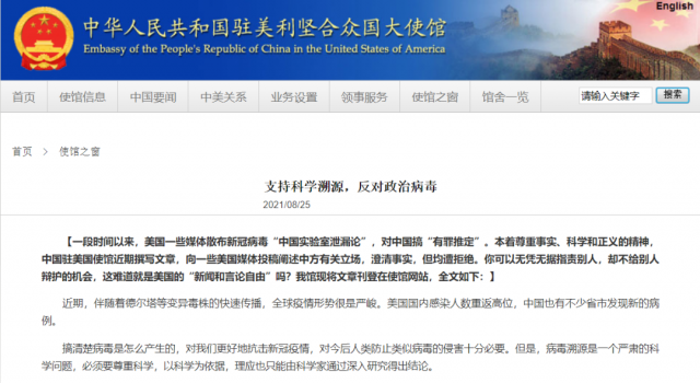 中國駐美國大使館24日在網(wǎng)站刊發(fā)《支持科學(xué)溯源,反對政治病毒》一文。該文的按語(yǔ)中指出,一段時(shí)間以來(lái),美國一些媒體散布新冠病毒“中國實(shí)驗室泄漏論”,對中國搞“有罪推定”,使館近期撰寫(xiě)文章,旨在向一些美國媒體投稿闡述中方有關(guān)立場(chǎng),澄清事實(shí),但均遭拒絕。你可以無(wú)憑無(wú)據指責別人,卻不給別人辯護的機會(huì ),這難道就是美國的“新聞和言論自由”嗎?
