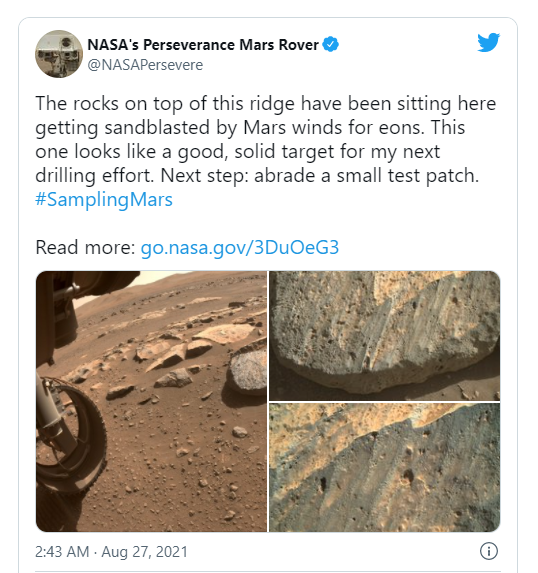 NASA 現在已經(jīng)鎖定了一塊被稱(chēng)為"Rochette"的巖石。該漫游車(chē)將用一個(gè)研磨工具對巖石進(jìn)行一些粗加工,以獲得更好的外觀(guān),并幫助團隊決定這是否確實(shí)是他們想要取樣的巖石。如果可以的話(huà),漫游車(chē)將鉆進(jìn)巖石,收集一個(gè)鉛筆厚的核心部分,并將其封入一個(gè)樣品管。