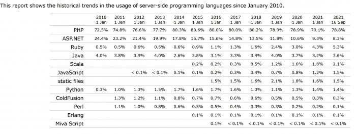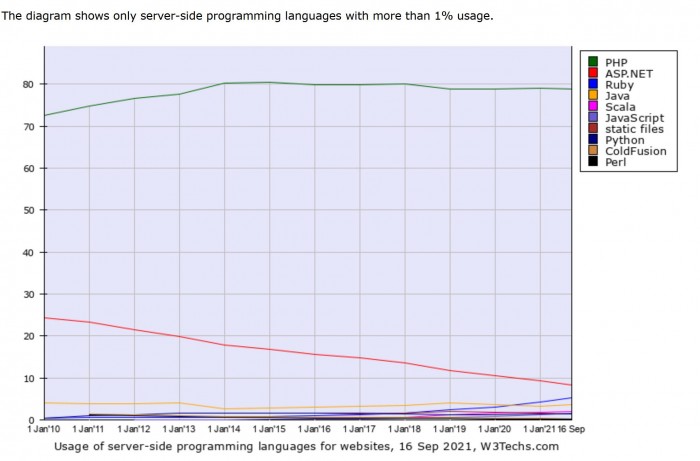 根據調查,PHP 在 2010 年的市場(chǎng)份額為 72.5%,而在 2021 年占比達到 78.9%。只有一個(gè)其他的服務(wù)器端語(yǔ)言曾經(jīng)突破 10% 的份額--這個(gè)競爭對手是 ASP.NET,它在 2010 年擁有令人印象深刻的 24.4% 的份額,但在 1 月份下降到 9.3%,這個(gè)月下降到 8.3%。