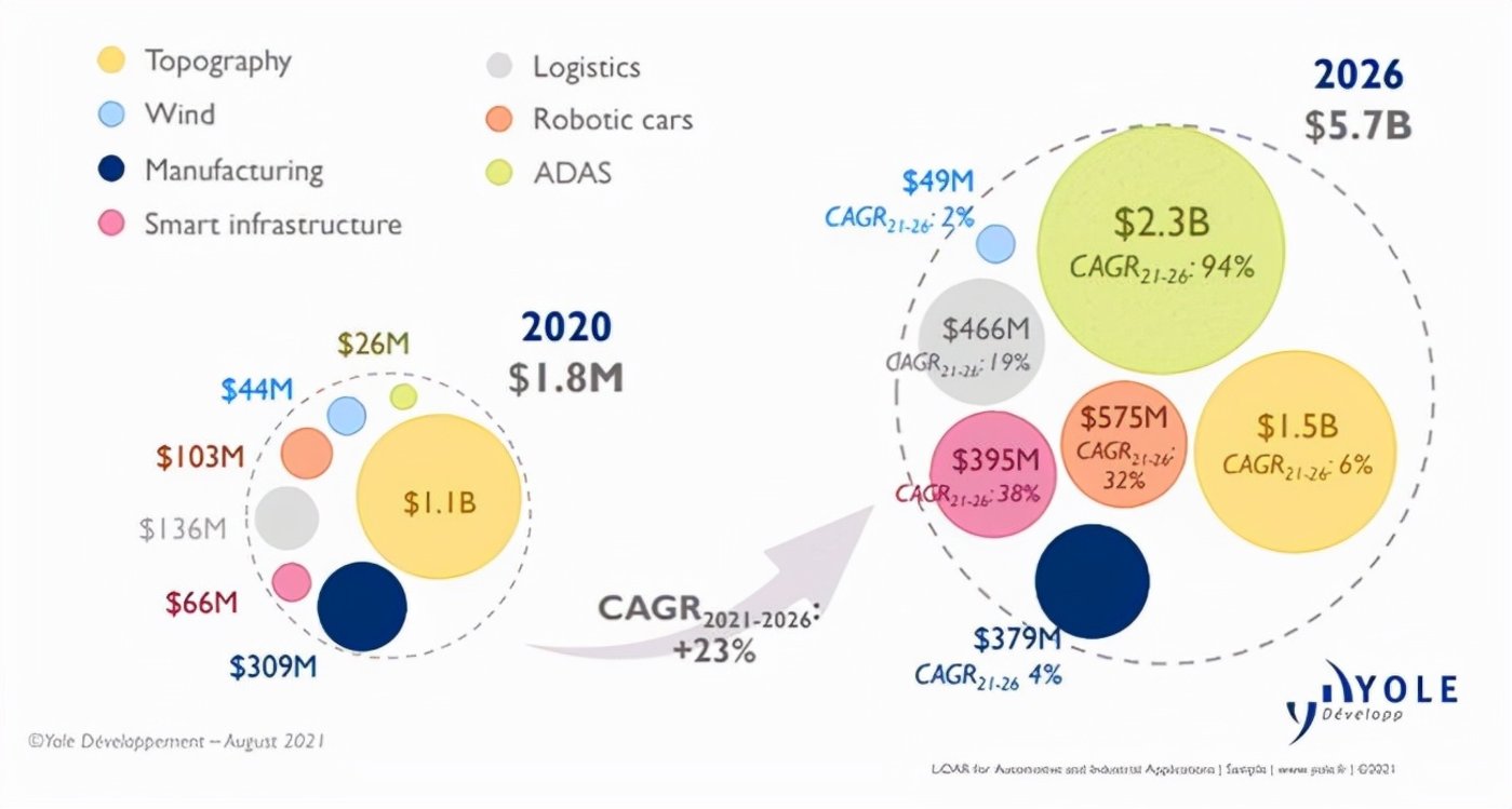 據 Yole 預測,到 2026 年激光雷達市場(chǎng)規模將達到 57 億美元,2020-2026 年,年復合增長(cháng)率將達到 21%,細分市場(chǎng)里,智慧城市增速最快將達到 35%;自動(dòng)駕駛出租車(chē)和巴士增速為 33%;智能物流為 23%。