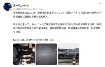 9 月 24 日,集度 CEO 夏一平宣布,集度成立 207 天,軟件團隊已基于 SIMU Car(模擬樣車(chē))與百度 Apollo 團隊協(xié)作智能座艙以及智能駕駛功能的開(kāi)發(fā)。