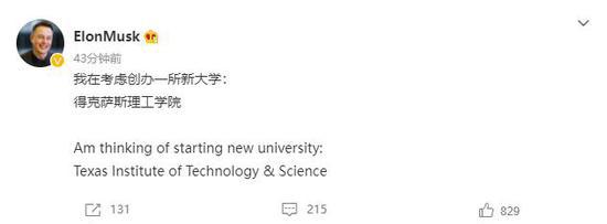 10 月 29 日下午消息,特斯拉 CEO 埃隆·馬斯克微博發(fā)文表示在考慮創(chuàng )辦一所新大學(xué),名為得克薩斯理工學(xué)院(Texas Institute of Technology & Science)。