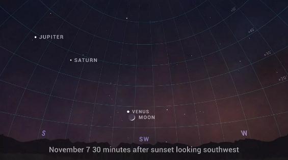 雖然周日將迎來(lái)月亮和金星最親密的時(shí)刻,但將會(huì )有一個(gè)延長(cháng)的窗口讓人們可以看到一些偉大的行星觀(guān)測機會(huì )。“從 11 月 6 日到 11 日,看月亮在日落后從金星、土星和木星的南部/西南部滑過(guò),”NASA 說(shuō)道。