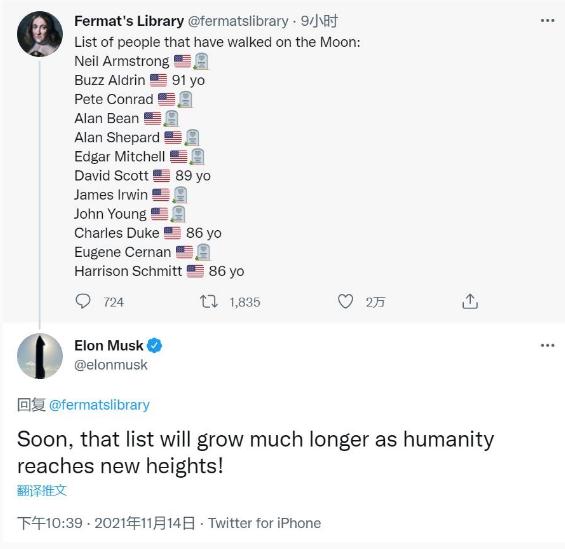 北京時(shí)間 11 月 15 日消息,特斯拉公司 CEO 埃隆·馬斯克(Elon Musk)周日在 Twitter 上回復網(wǎng)友稱(chēng),“隨著(zhù)人類(lèi)達到新高度,在月球上行走的人的名單將很快變得越來(lái)越長(cháng)”。