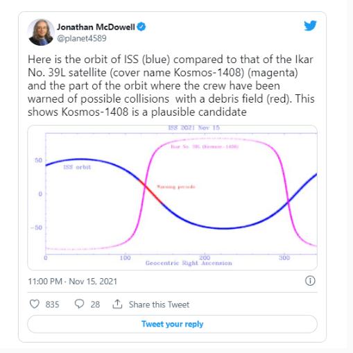 哈佛大學(xué)的天體物理學(xué)家和衛星追蹤者麥克道爾計算了第一個(gè)碎片場(chǎng)經(jīng)過(guò)的時(shí)間,該時(shí)間發(fā)生在美國東部時(shí)間周一凌晨 2 點(diǎn) 06 分左右。他發(fā)現,自第一次經(jīng)過(guò)以來(lái),大約每隔 93 分鐘就會(huì )有一次經(jīng)過(guò)。在計算出 Kosmos 1408 的軌道后,他發(fā)現該衛星和國際空間站的路徑確實(shí)每隔一個(gè)半小時(shí)就會(huì )接近對方。