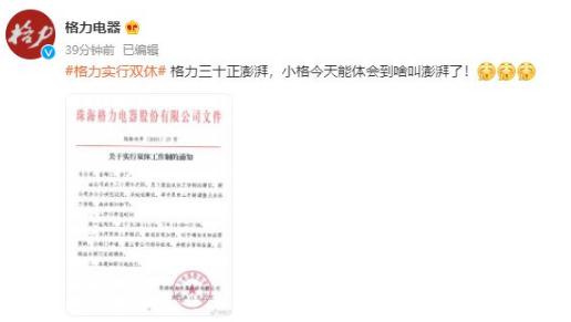 格力電器官方微博發(fā)布通知,將單雙休工作制調整為雙休工作制。工作時(shí)間為周一到周五上午8:30-11:45,下午 13:30-17:30。