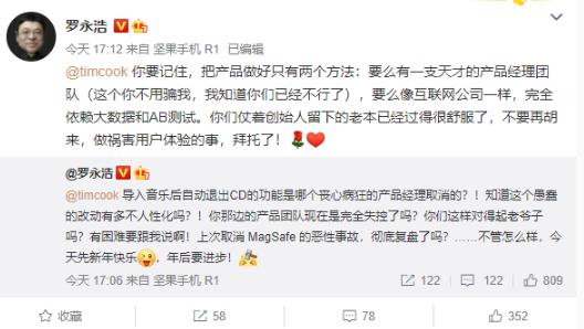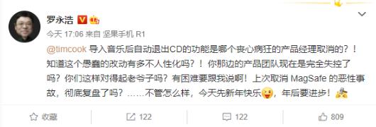 羅永浩發(fā)文稱(chēng),“@timcook 導入音樂(lè )后自動(dòng)退出 CD 的功能是哪個(gè)喪心病狂的產(chǎn)品經(jīng)理取消的?!知道這個(gè)愚蠢的改動(dòng)有多不人性化嗎?!你那邊的產(chǎn)品團隊現在是完全失控了嗎?你們這樣對得起老爺子嗎?有困難要跟我說(shuō)啊!上次取消 MagSafe 的惡性事故,徹底復盤(pán)了嗎?……不管怎么樣,今天先新年快樂(lè ),年后要進(jìn)步!”