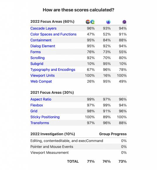 從根本上講,Interop 2022 是一個(gè)不斷發(fā)展的指標,用于評估各大瀏覽器對上述 Web 標準的兼容程度。Interop 2022 儀表板 有一個(gè)評分系統,評估各大瀏覽器的整體兼容程度: