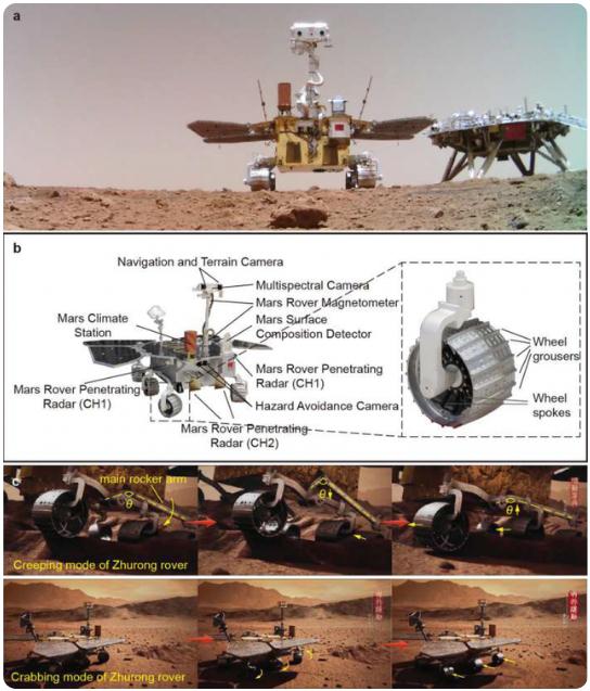 “祝融號”火星車(chē),圖片來(lái)自論文“祝融號”高度為1.85米,重量約為240公斤。此次,研究人員利用“祝融號”運動(dòng)數據與相機圖像,確定它在前60個(gè)火星日里向南行進(jìn)的距離為450.9米,并通過(guò)分析“祝融號”輪子與下方地形的相互作用力以及避障相機拍攝的輪轍影像,推斷出著(zhù)陸地點(diǎn)火星表面土壤具有較高的承載強度和粘聚力,還辨別出該區域符合風(fēng)蝕特性的地貌(如沙脊、波紋、侵蝕坑以及巖石紋理等),其中風(fēng)成床面形態(tài)以橫向沙脊為主,當地風(fēng)向為東北方向。同時(shí),著(zhù)陸地區顯示出平緩的地形狀況,其地表的主要地質(zhì)特征包括風(fēng)成床面形態(tài)、小隕石坑和巖石。這些初步發(fā)現表明“祝融號”火星車(chē)的著(zhù)陸位置相較于其他火星著(zhù)陸點(diǎn),具有更加明顯、易于研究的地貌特征,將有望對火星北半球低地的表面環(huán)境演化帶來(lái)更多見(jiàn)解。