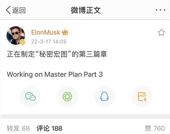 3 月 17 日,特斯拉 CEO 埃隆·馬斯克發(fā)布微博稱(chēng),“正在制定‘秘密宏圖’的第三篇章”。