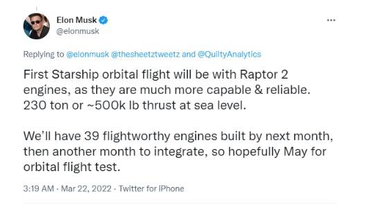 馬斯克在推特上稱(chēng):“到下個(gè)月,我們將制造出 39 個(gè)適合飛行的引擎,然后再花一個(gè)月進(jìn)行整合,希望 5 月份能進(jìn)行軌道飛行測試。”