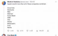 The World Of Statistics 在最新推文中表示,蘋(píng)果公司的市值已經(jīng)超過(guò)了可口可樂(lè )、耐克等 11 家藍籌公司的市值總和。隨后馬斯克轉